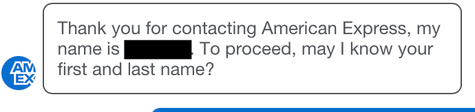 “Thank you for contacting American Express, my name is [NAME]. To proceed, may I know your first and last name?”