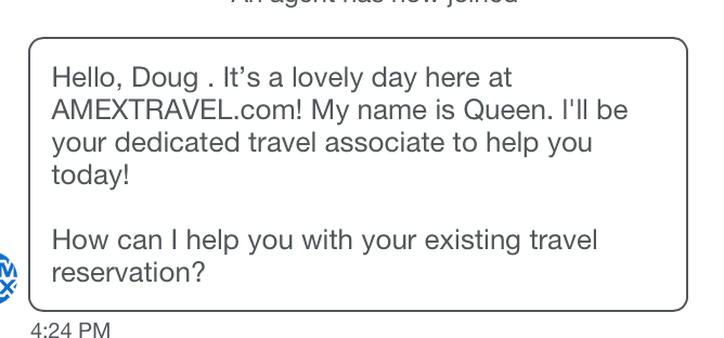 “Hello, Doug. It’s a lovely day here at AMEXTravel.com! My name is Queen. I’ll be your dedicated travel associate to help you today! How can I help you with your existing travel reservation?”